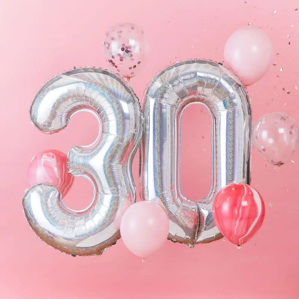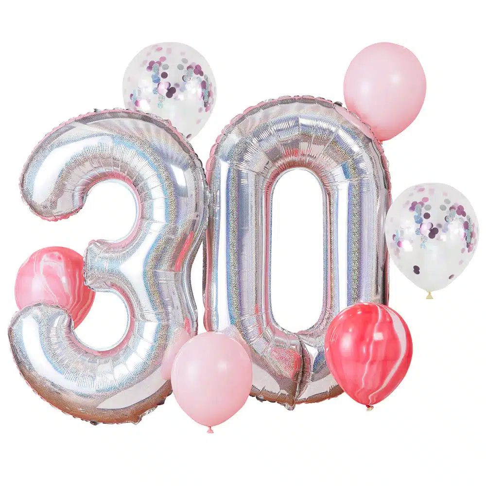 Gjør en tydelig og trendy markering av 30-års bursdagen med denne vakre ballongbunten som inneholder 2stk tallballonger på hele 91cm og 6stk andre ulike ballonger! Fungerer like godt både som photo booth bakgrunn eller dekor.